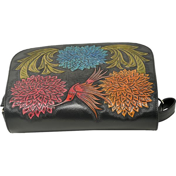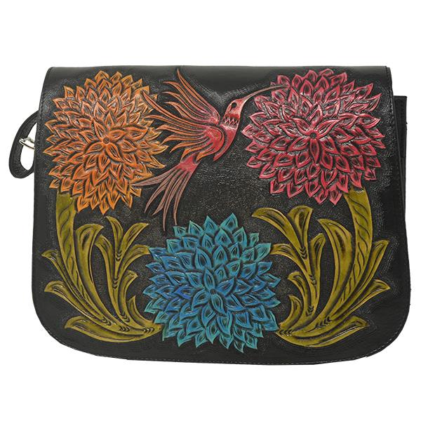 HUMMINGBIRD LEATHER CROSSBODY BAG FEATURES HAND COLORING TOOLING - BLK 13" x 2" x 9"