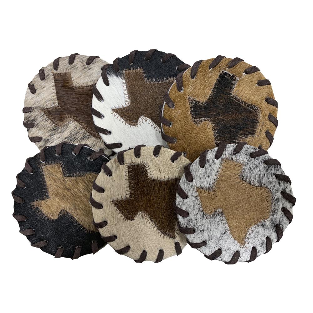 COASTER WITH HAIR ON COWHIDE, TEXAS MAP, ASSORTED COLORS, LEATHER LACED BORDER (HOLDER SOLD SEPA...
