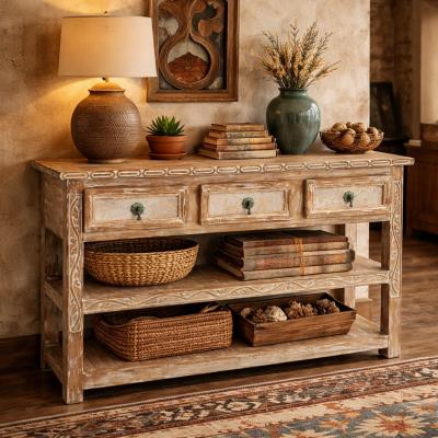 "Desert Sage" - Hand carved console featuring reclaimed wood top, storage shelf and verdigris wash finish