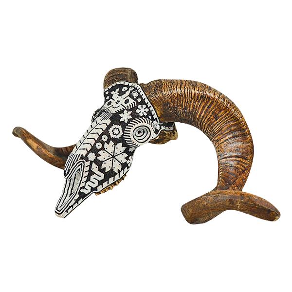 HUICHOL SKULL - SYNTHETIC SKULL WITH TRADITIONAL HUICHOL HAND BEADING - BLACK & WHITE 22" ...