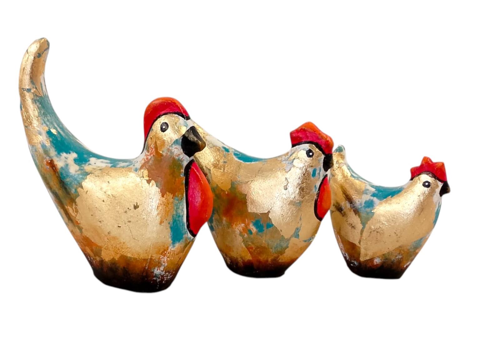 SET OF 3 CLAY CHICKENS IN SHINY GOLD FINISH (4.5x1.5x5, 6.5x1.5x7, 7.5x2x9)
