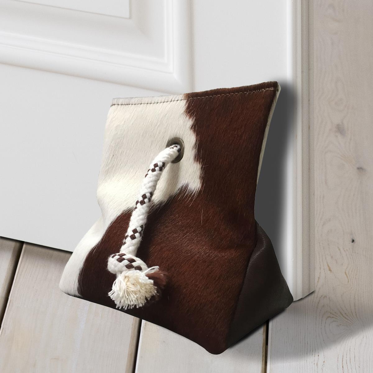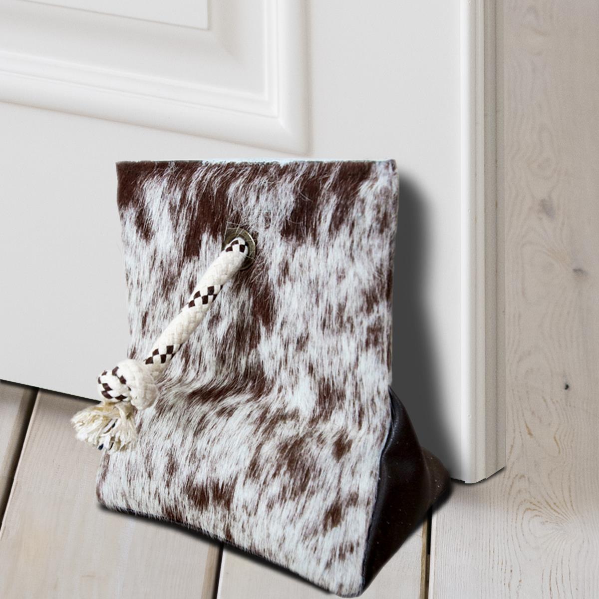 DOOR STOPPER MADE OF COWHIDE (WEIGHTED WITH SAND) - BROWN AND WHITE - 8" x 7"