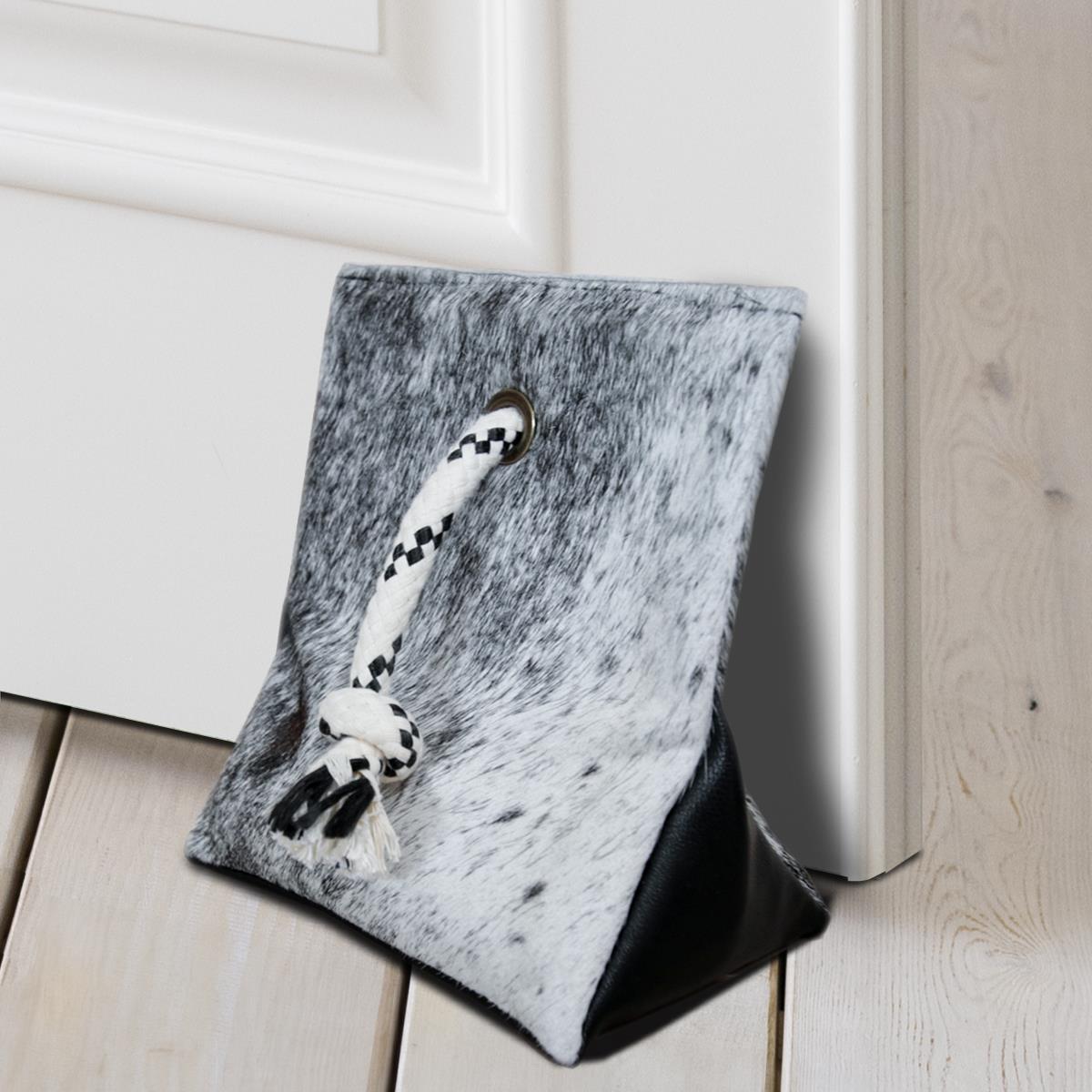 DOOR STOPPER MADE OF COWHIDE (WEIGHTED WITH SAND) - SALT & PEPPER BLACK - 8" x 7"