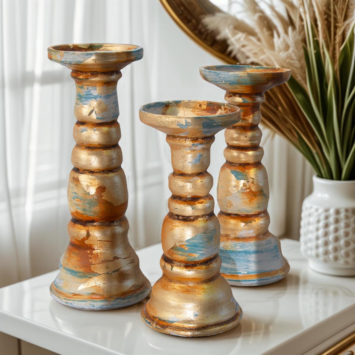 SET OF 3 CLAY CANDLE HOLDERS IN SHINY GOLD FINISH (3.5x9.5, 4x11, 5x12.5)