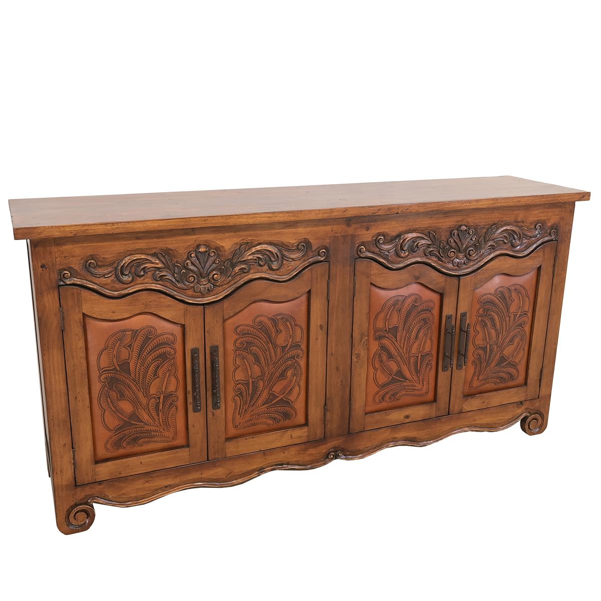 "Saddler" - Hand-carved buffet featuring four doors with tooled leather padded door inserts