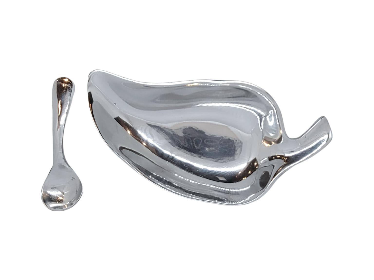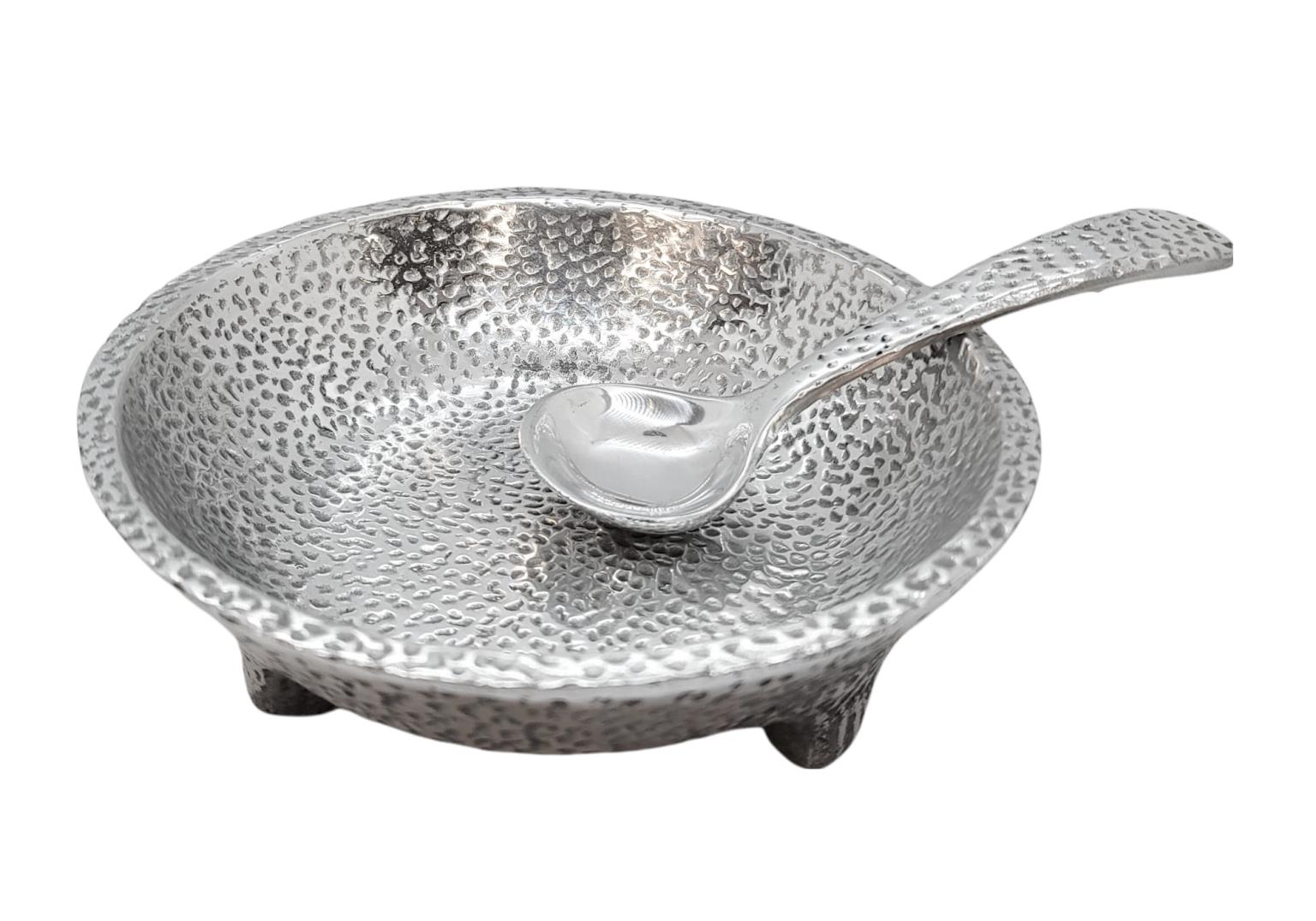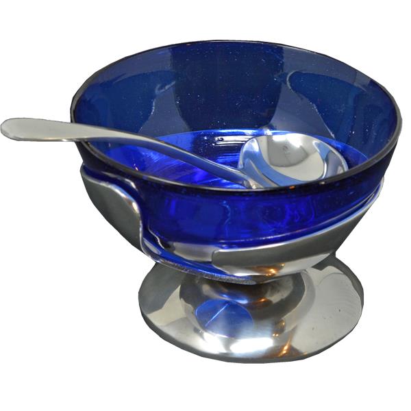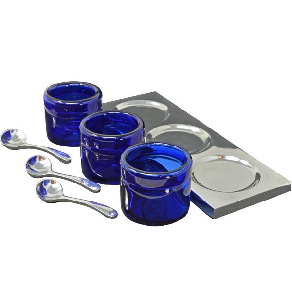 COBALT BLUE SET OF 3 SALSA BOWLS ON PEWTER BASE (BASE: 13" x 5" BOWL: 3.5" x 3" SPOON: 4.5")