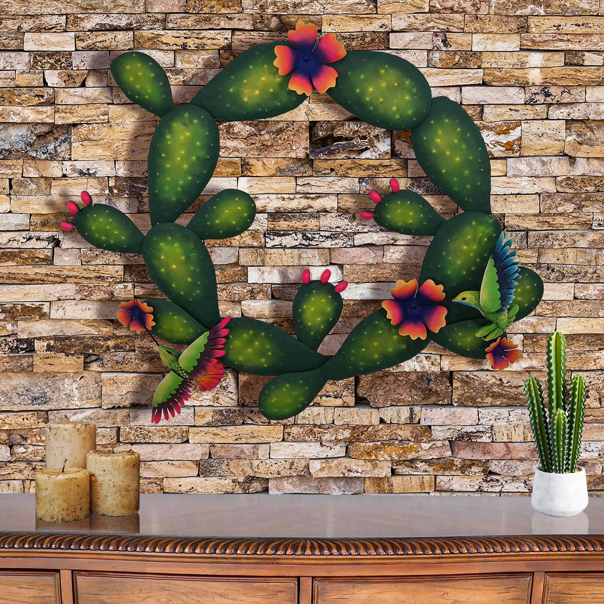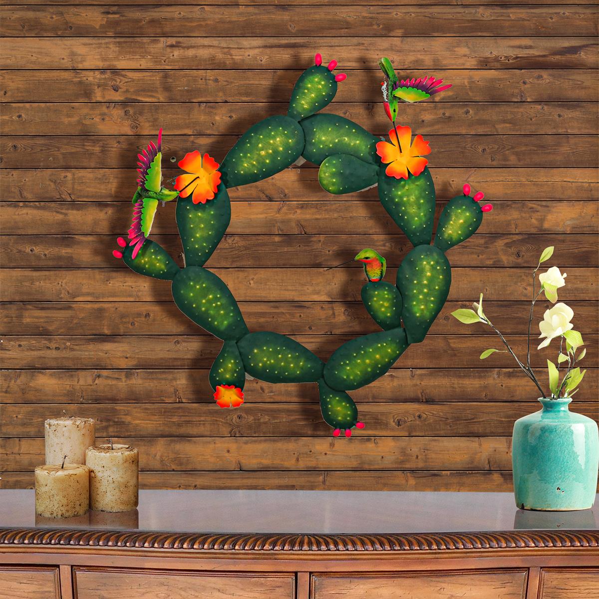 PRICKLY PEAR, PINK FLOWERS & HUMMINGBIRDS WREATH WALL HANGING